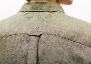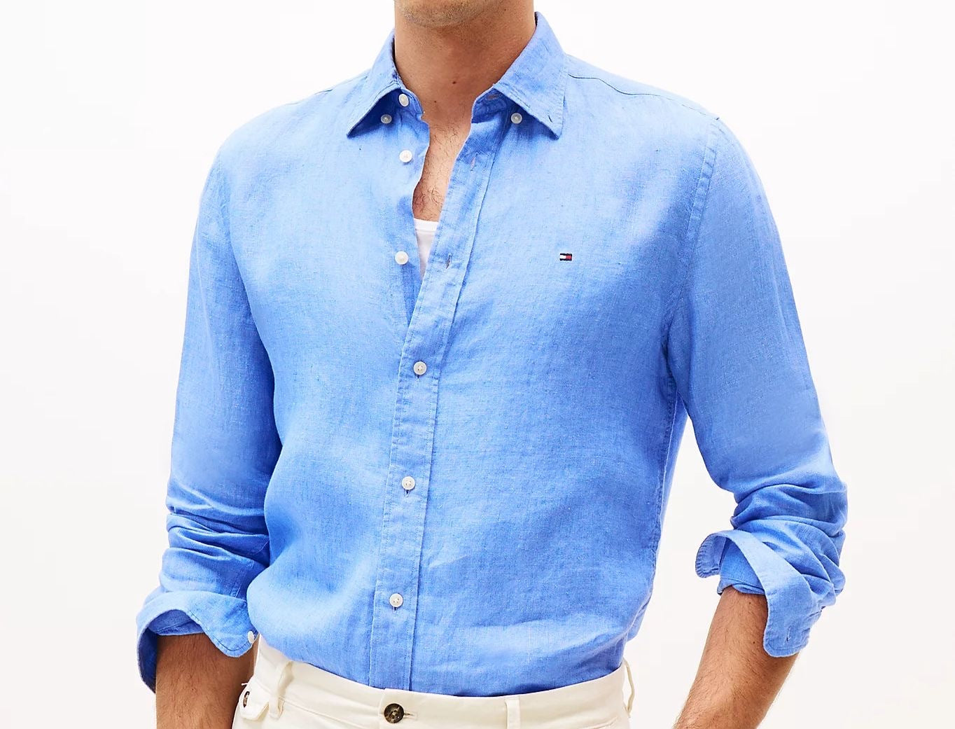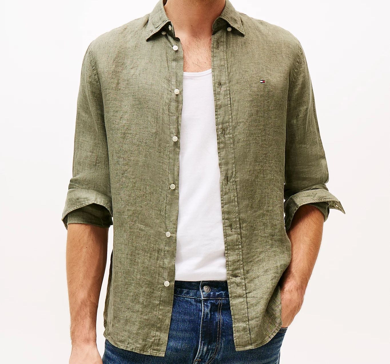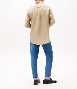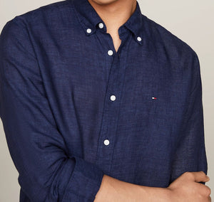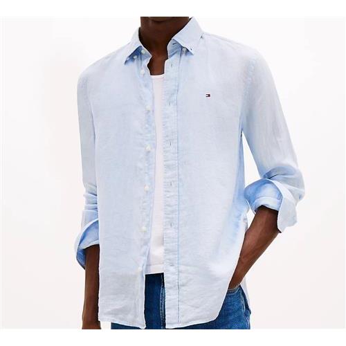 Camicia in puro lino, tinta con pigmenti, colletto button down, polsini arrotondati con bottone, branding Tommy Hilfiger, bandierina Tommy Hilfiger ricamata sul petto