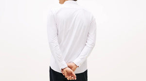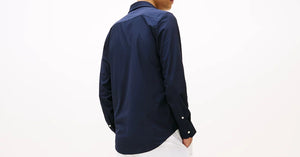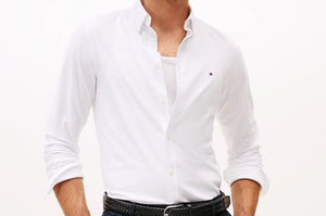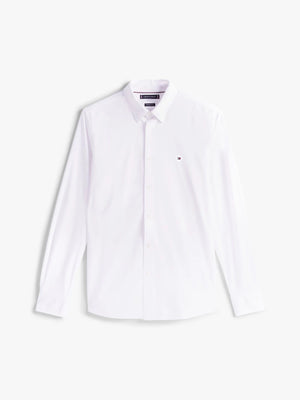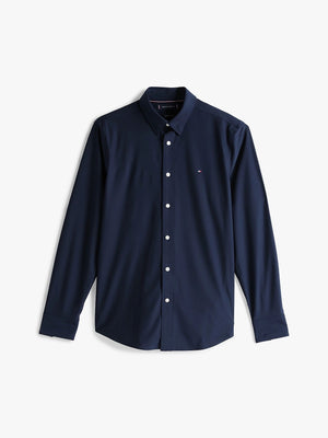 Tessuto tecnico, tecnologia Flex, antiumidità, traspirante, antiodore, idrorepellente, colletto semifrancese, polsini arrotondati con due bottoni, nastro iconico all'interno del collo, branding Tommy Hilfiger, bandierina Tommy Hilfiger ricamata sul petto