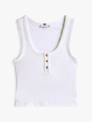 Cotone stretch, texture a coste, scollatura ovale, collo henley, bottoni dorati con stemma TH impresso sul davanti, branding Tommy Hilfiger, bandierina Tommy Hilfiger in metallo sul retro del collo