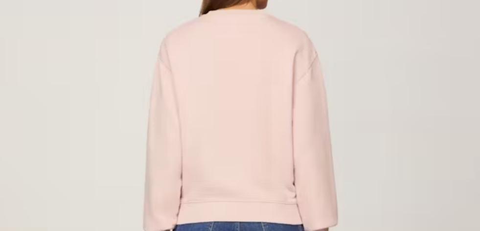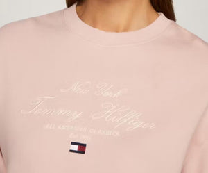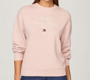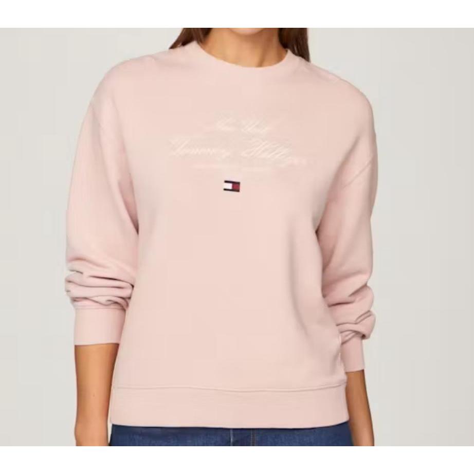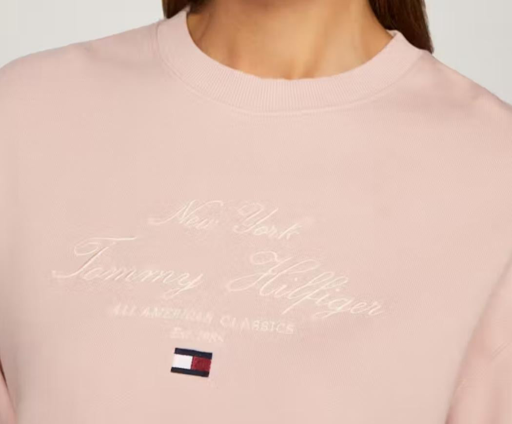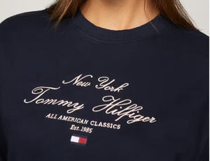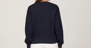 Felpa donna relaxed, in spugna di puro cotone blu, con scollolatura rifinita a costine e ricamo logo Tommy Hilfiger sul fronte.