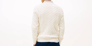 Il pullover in puro cotone, con la classica lavorazione a maglia intrecciata, diventa unico grazie ai dettagli iconici.