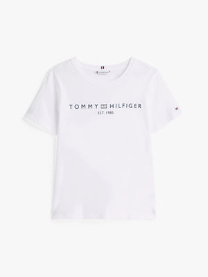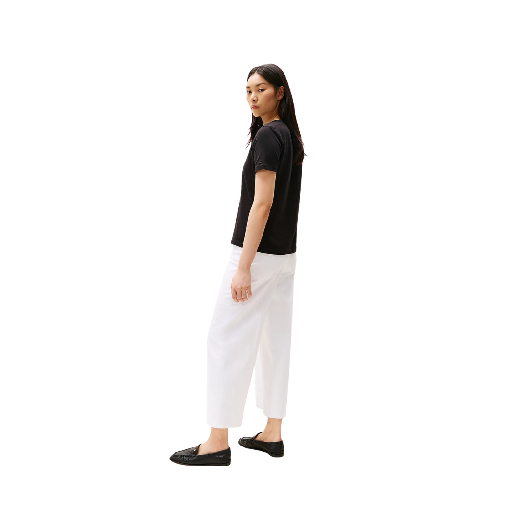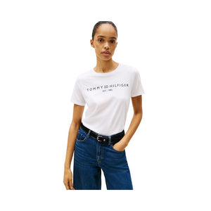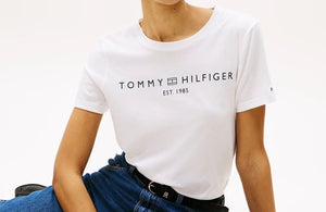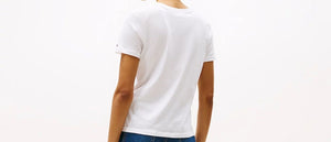 Il design è pulito ma ricco di dettagli che raccontano l’identità del brand: il logo Tommy Hilfiger stampato sul petto, la bandierina ricamata sulla manica e il nastro iconico sul retro del collo aggiungono un tocco distintivo senza eccessi. Il taglio dritto e il girocollo classico la rendono versatile e facile da abbinare: con jeans bianchi per un contrasto fresco, oppure con pantaloni ampi per un mood più rilassato e contemporaneo.