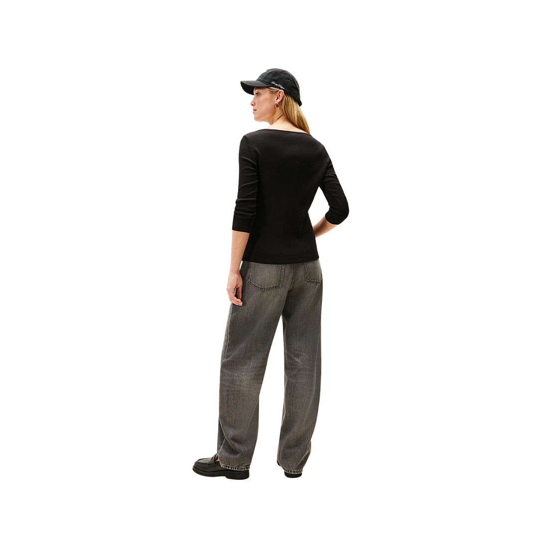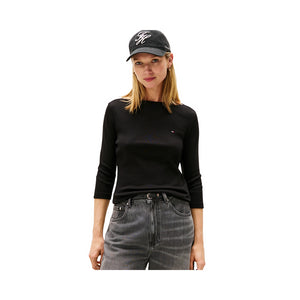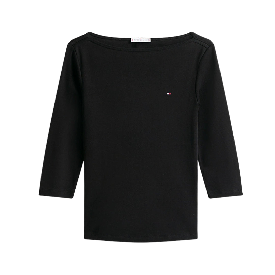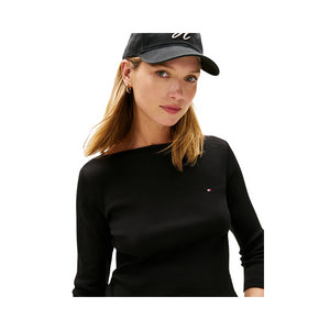 Il dettaglio distintivo è la scollatura a barca, femminile e raffinata, che valorizza collo e spalle con discrezione. Le maniche a tre quarti la rendono un’ottima alleata per le serate più fresche o per ambienti climatizzati, mantenendo uno stile pulito e versatile. Il logo ricamato sul petto e il nastro iconico sul retro del collo firmato Tommy Hilfiger completano il look con un tocco autentico e inconfondibile.