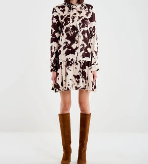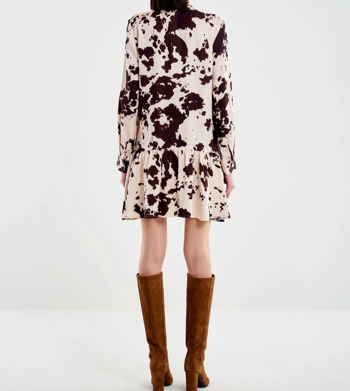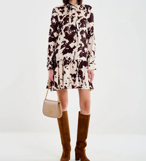 Abito corto chemisier maniche lunghe. Chiusura frontale con bottoncini e fiocco al collo. Gonna leggermente svasata. Tessuto in fantasia cow.