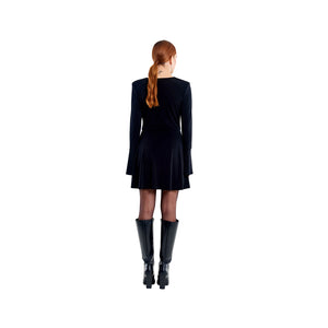Abito corto scollo a v e maniche lunghe. dettaglio volant sul collo e manica ampia sul fondo.