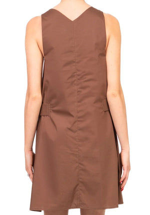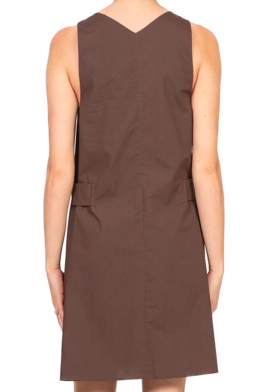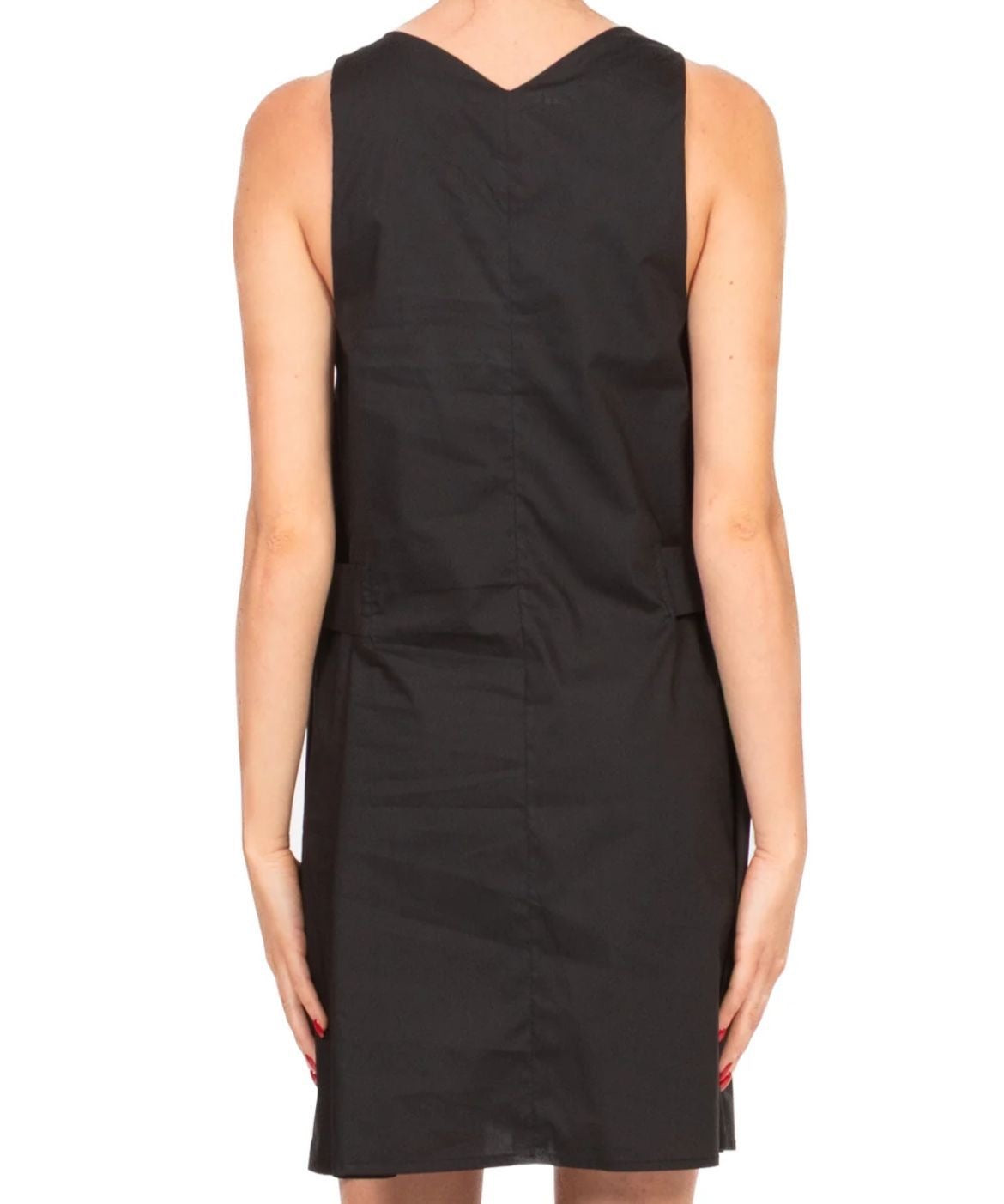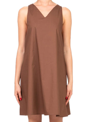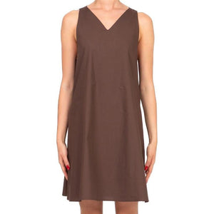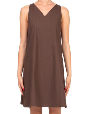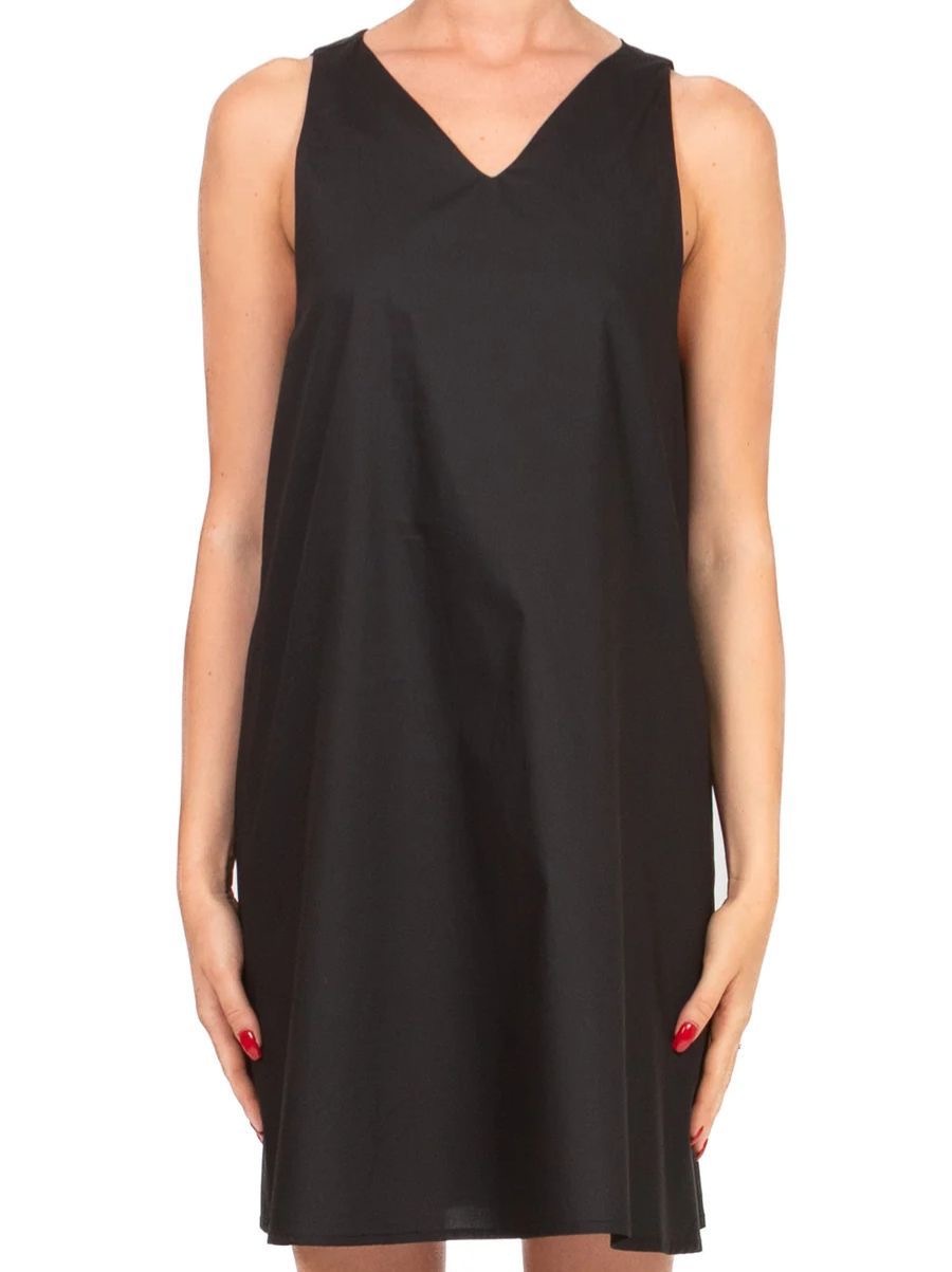 Abito corto senza maniche con scollo a v. Dettaglio finta cintura passante sul retro. Gonna ampia svasata.