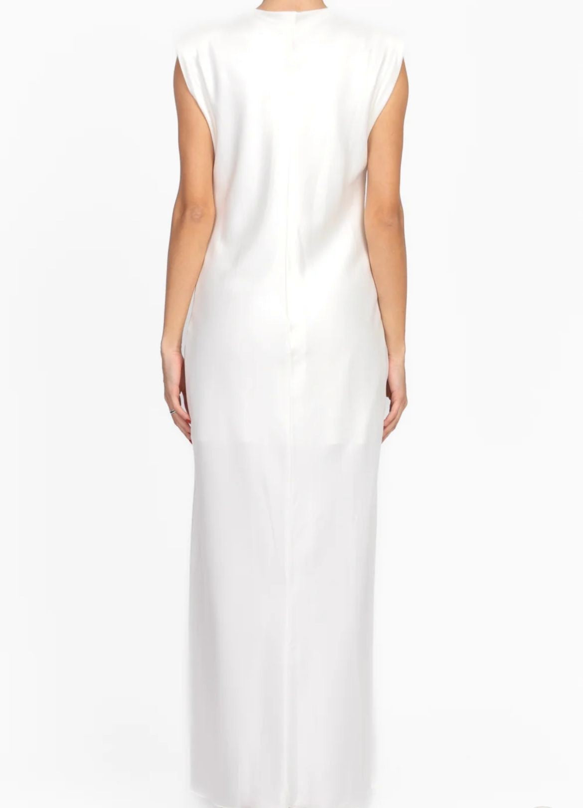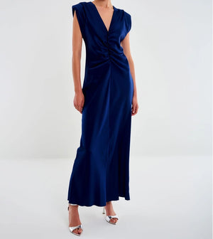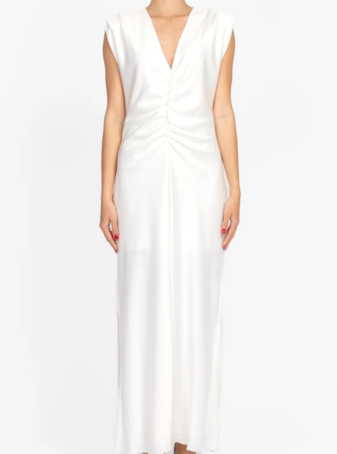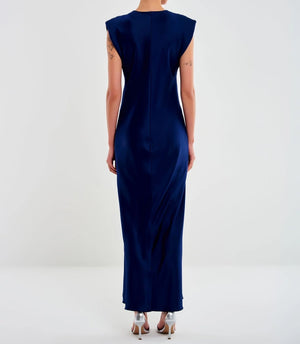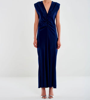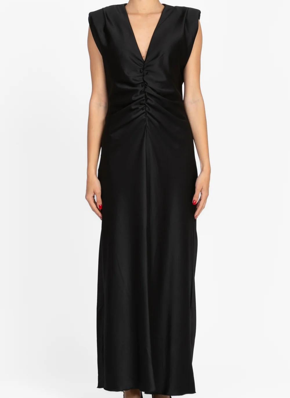 Abito lungo con scollo a v e spalline imbottite. Dettaglio arriccio centrale frontale. Tessuto effetto satinato.