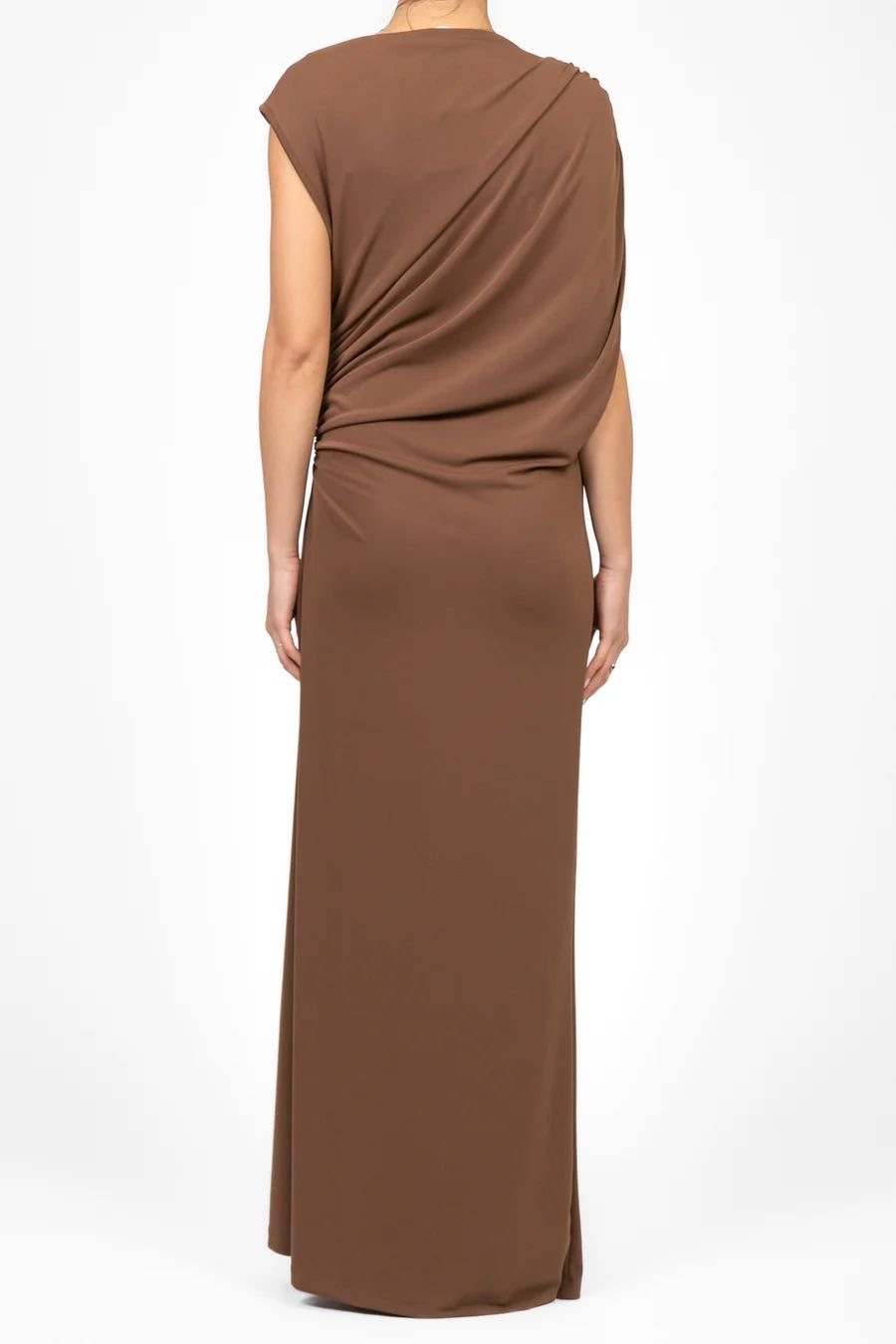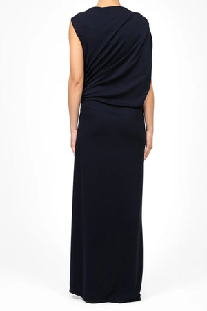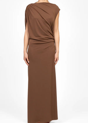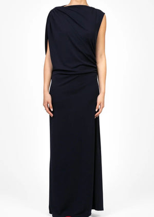 Abito lungo drappeggiato con scollo asimmetrico. Drappeggio sul lato e spacco frontale.