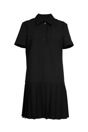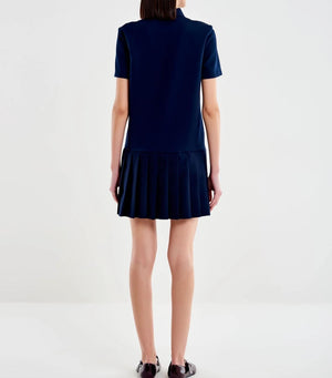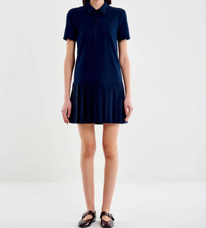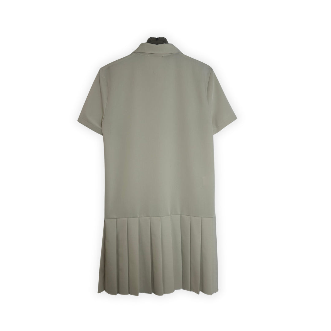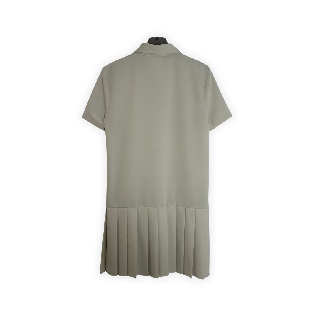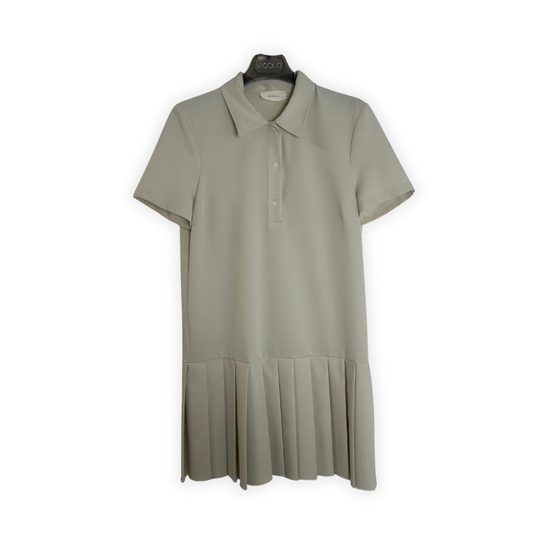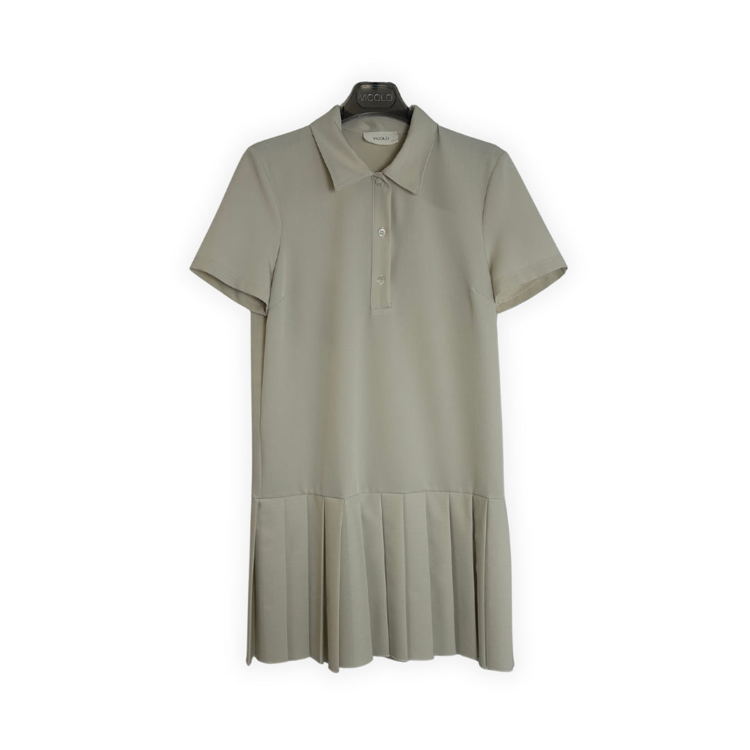 Abito a maniche corte con colletto. Gonna corta plissè. Chiusura frontale con bottoncini.