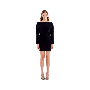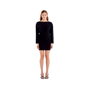 Abito corto maniche lunghe con retro drappeggiato. Dettaglio laccio con fiocchetto sul retro.