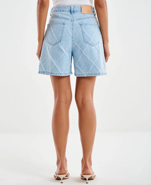 Bermuda in Denim vita media. Modello cinque tasche. Gamba ampia. Dettaglio fantasia a rombi. Chiusura con zip e bottoni.