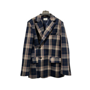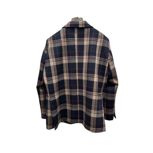 Blazer a quadri con motivo scozzese nei toni del blu, beige e rosa cipria, reinterpretato in chiave contemporanea. La linea leggermente over e i revers classici conferiscono un’eleganza disinvolta, mentre le tasche con patta e la fodera interna valorizzano la cura sartoriale del capo. Realizzato con attenzione ai dettagli, combina comfort e stile in un equilibrio perfetto.