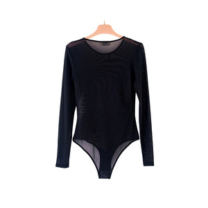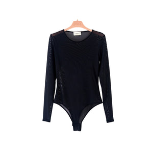 Body in tulle maniche lunghe girocollo. Chiusura con bottoncini sul fondo.
