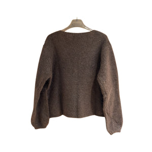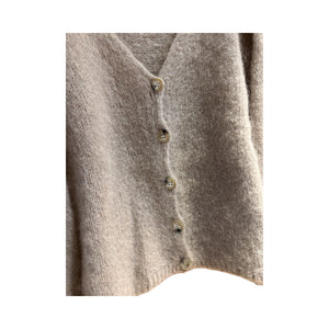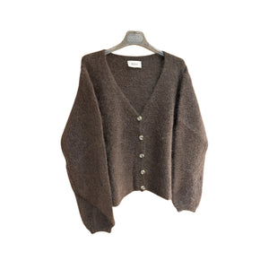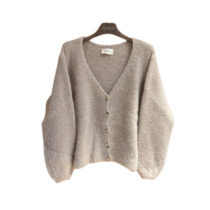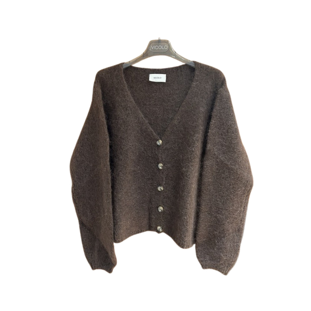 Cardigan soffice e avvolgente caratterizzato da un design pulito e contemporaneo. Presenta uno scollo a V profondo che valorizza la scollatura e una chiusura frontale con cinque bottoni in evidenza. Le maniche ampie e il taglio leggermente oversize conferiscono un look rilassato ma raffinato, ideale sia per outfit casual che più eleganti. Il tessuto morbido e vaporoso dona una piacevole sensazione di comfort, perfetta per le stagioni più fresche. Un capo versatile che unisce semplicità e stile senza tempo.