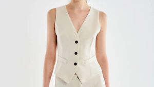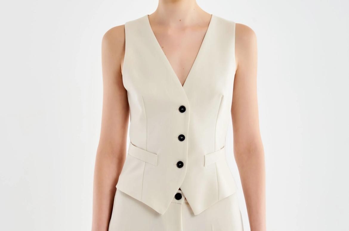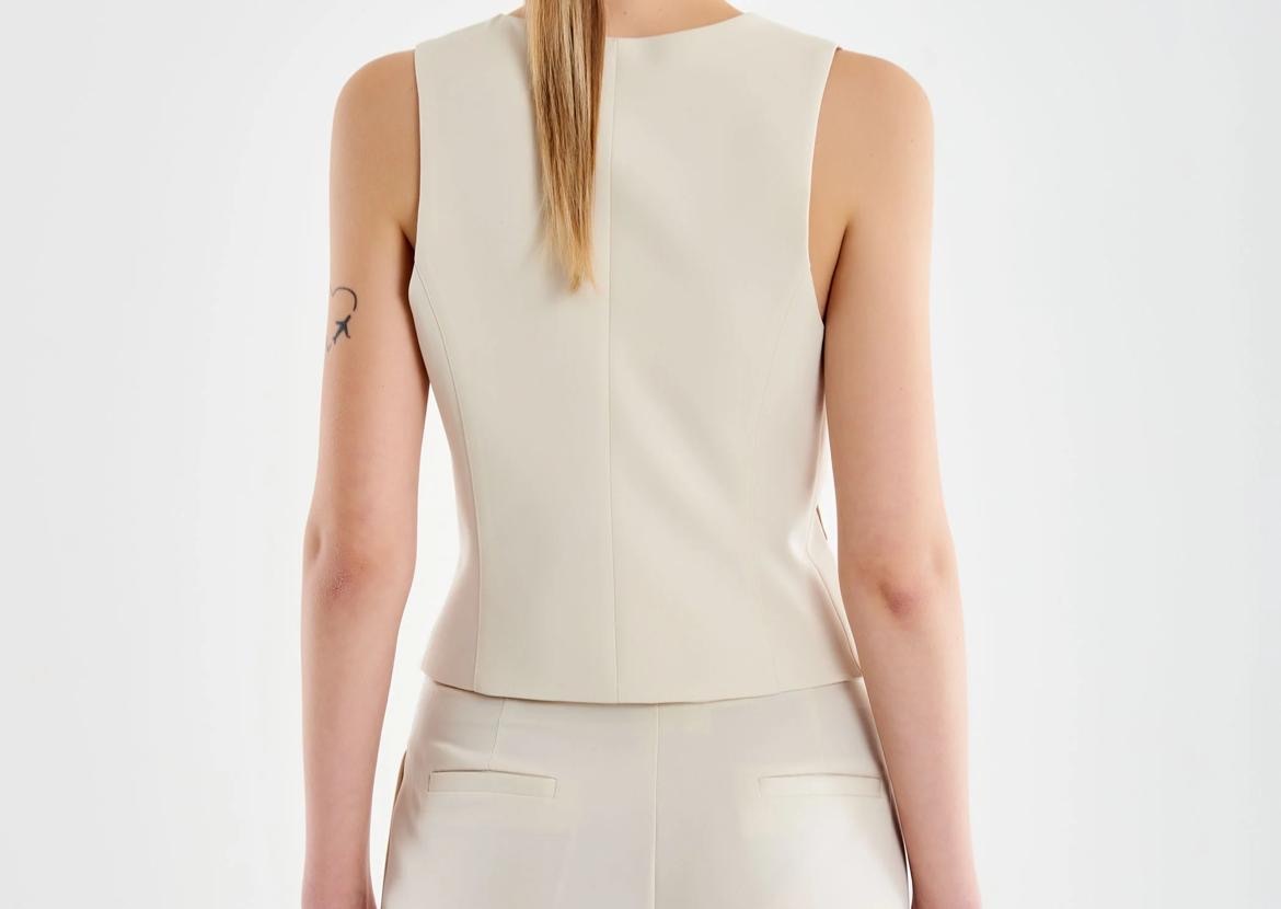 Gilet corto con bottoni frontali e scollo a V. Finte tasche a filetto sulla parte frontale.