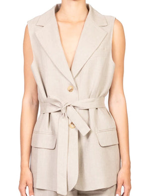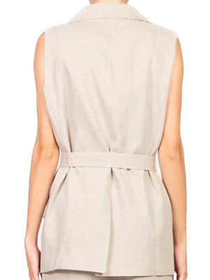 Gilet monopetto con revers e cintura. Tasche frontali a pattina. Spacchi laterali.