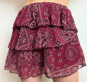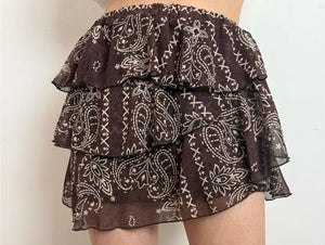 Minigonna a balze in georgette stampa bandana, strutturata a balze asimmetrica con banda elastica arricciata in vita