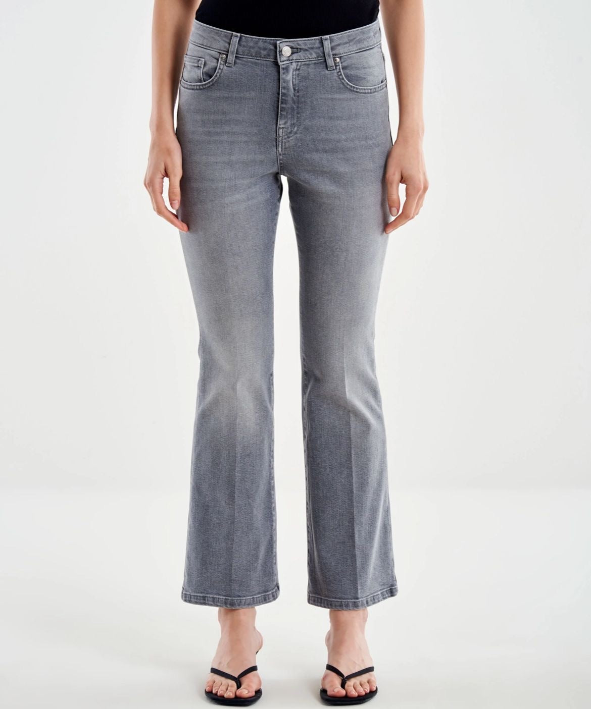 Jeans a vita media con fondo a zampa nero. Modello cropped. Modello cinque tasche. Chiusura frontale con zip e bottone. Dettaglio denim grigio slavato.