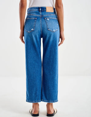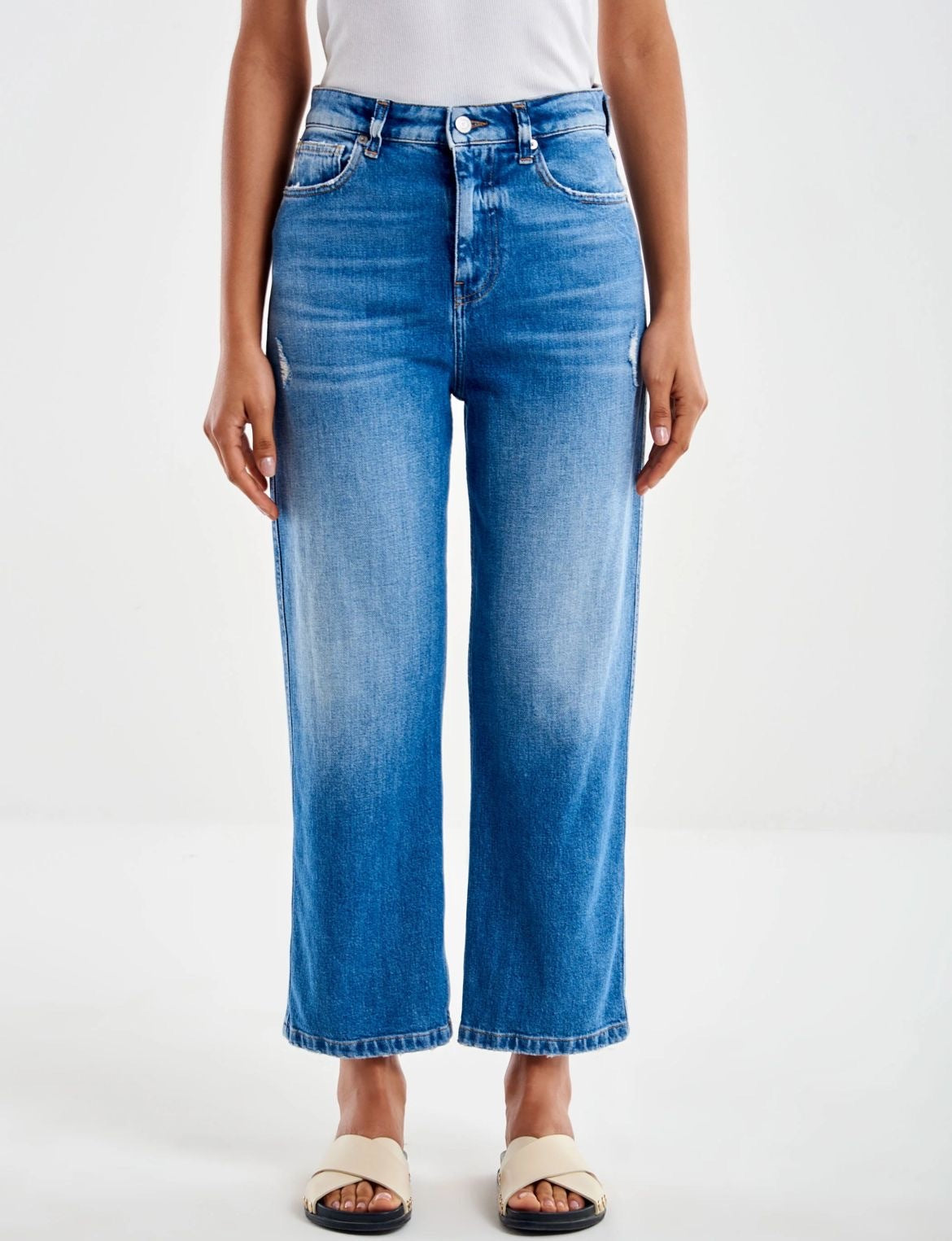 Jeans a vita alta con gamba dritta e fit morbido. Modello cinque tasche. Modello cropped. Chiusura frontale con zip e bottone. Denim Blu con sfumature