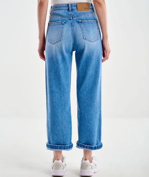 Jeans a vita alta con gamba dritta e fit morbido. Modello cinque tasche. Modello cropped. Chiusura frontale con zip e bottone. Denim Blu con schiariture. Risvolto sul fondo.