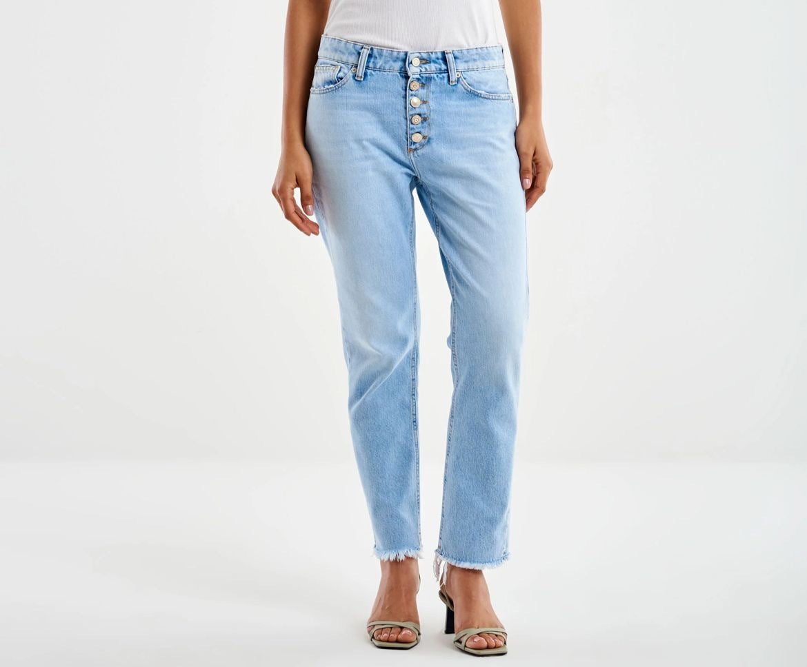 Jeans mom fit a vita alta modello cinque tasche. Gamba dritta e taglio più morbido sui fianchi. Effetto slavato sulla parte frontale. Chiusura frontale con bottoni decorati. Fondo sfrangiato.