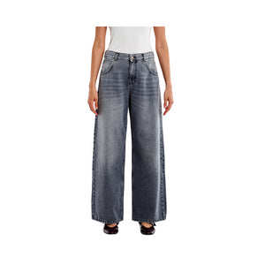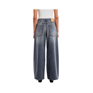 Jeans ampio modello cinque tasche. Chiusura frontale con zip e bottone in metallo. Vita media gamba ampia. Denim grigio con schiariture.