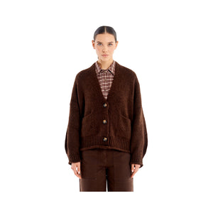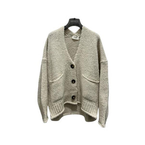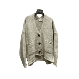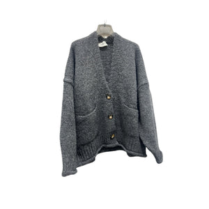 Maxi cardigan maniche lunghe scollo a v. Con tasche frontali applicate. Chiusura frontale con bottoni. Finiture in maglia a costina.