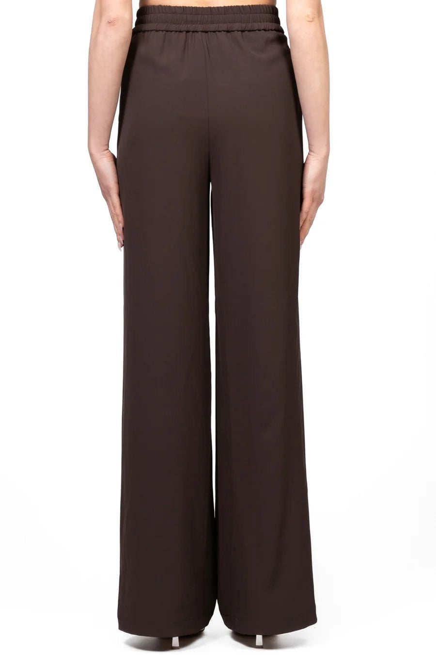 Linee ampie e sofisticate taglio elegante e contemporaneo. La vita alta valorizza la silhouette e garantisce una vestibilità confortevole, mentre il tessuto fluido scivola leggero lungo la gamba, creando un movimento armonioso a ogni passo.