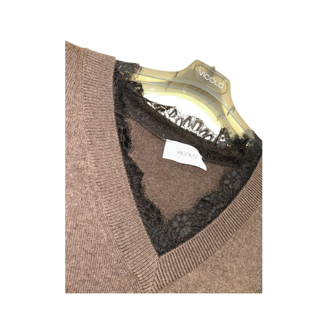 Questo pull firmato ViCOLO è un capo femminile e raffinato, perfetto per aggiungere un tocco romantico al guardaroba quotidiano. Realizzato in maglia morbida, presenta uno scollo a V che valorizza il décolleté con eleganza e sobrietà. Il dettaglio distintivo è rappresentato dagli inserti in pizzo, delicati e ben posizionati, che donano un effetto sofisticato e leggermente rétro al capo.