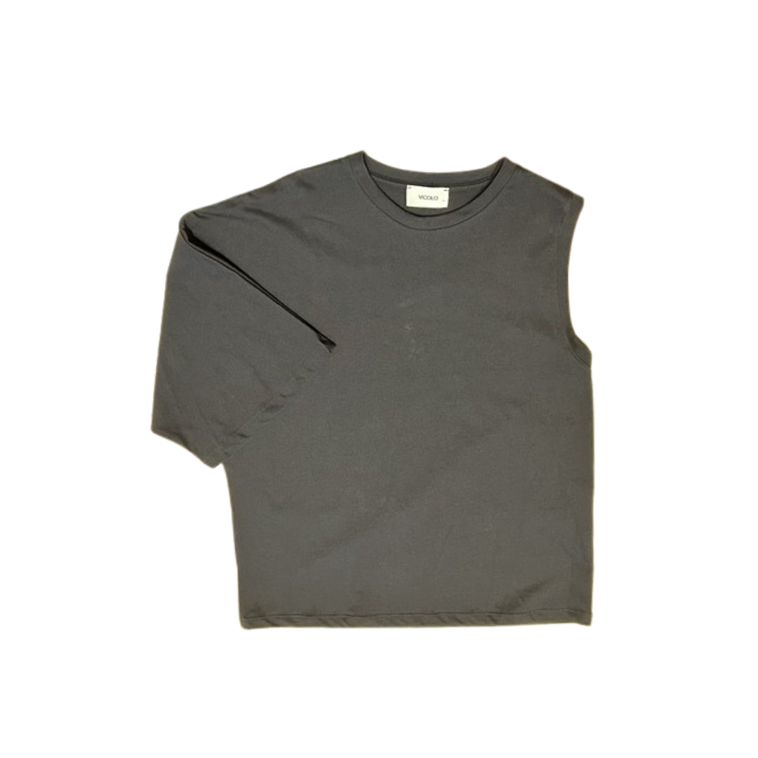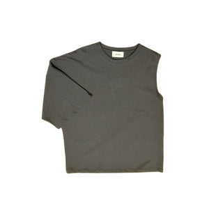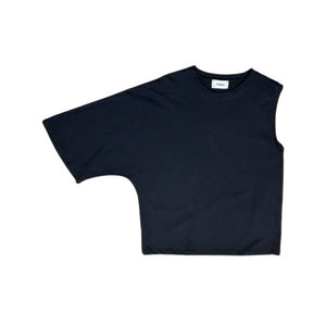 Realizzata in un tessuto morbido e confortevole, ideale per l’uso quotidiano, mantiene la struttura e la pulizia tipica della t-shirt classica, ma con un twist stilistico che non passa inosservato. Le maniche asimmetriche, di lunghezze e tagli differenti, creano un dinamismo visivo unico, perfetto per chi cerca un look minimal ma con carattere.